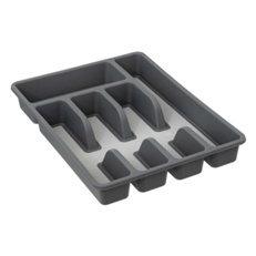 Besticklådan har fem separata fack i olika storlekar, så att varje typ av bestick får sin egen plats. Det större facket längst upp passar utmärkt för köksredskap, serveringsbestick eller annat som behöver lite extra utrymme. Den ljusgrå botten med halkskyddande struktur kontrasterar snyggt mot de mörkgrå facken och gör det lätt att se vad som ligger var.
