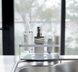 Samla diskmedel, svampar och borstar på ett ställe med den här smarta diskbänksförvaringen från japanska Yamazaki. Tack vare den sluttande botten rinner vattnet tillbaka ner i diskhon, så allt hålls torrt och fräscht.