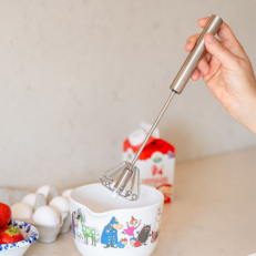 Praktisk och halvautomatisk handvisp som gör det enkelt att vispa, blanda och skumma ingredienser. Tack vare fjädermekanismen behöver du bara trycka ner handtaget för att skapa en snabbt roterande rörelse, vilket sparar både tid och energi vid matlagning och bakning. Tillverkad i rostfritt stål med skyddad spets för extra skonsamhet.