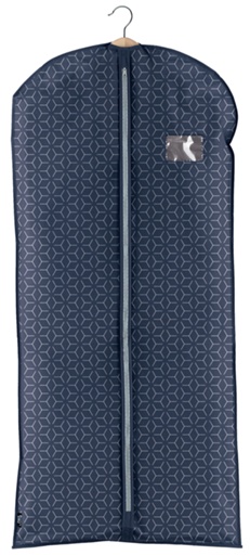 Det stilrena geometriska mönstret i blått gör att klädöverdraget ser snyggt ut även i en öppen garderob. Materialet i PEVA är lätt, hållbart och enkelt att torka av vid behov.