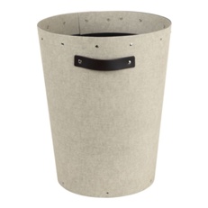 Papperskorgen är tillverkad av återvunnet material och klädd med en elegant canvaslaminat som ger ett mjukt, textilt uttryck. Silverfärgade nitar längs kanten och sömmen bidrar med en industriell touch som bryter av snyggt mot det textila materialet. Läderhandtaget gör det enkelt att flytta korgen mellan rum eller lyfta undan när man städar.