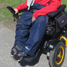 Svenskdesignad regn- och vindbyxa för rullstolsburna. Byxan är designad med en öppning baktill för att underlätta påklädning. Det är även enkelt att justera passformen när byxan sitter på.