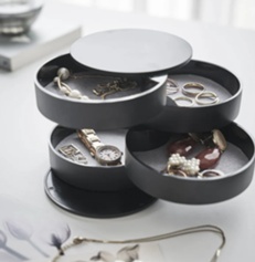 En smyckesask som rymmer överraskande mycket på liten yta. Med fyra roterande nivåer får du ordning på ringar, örhängen, armband och klockor utan att de trasslar ihop sig.